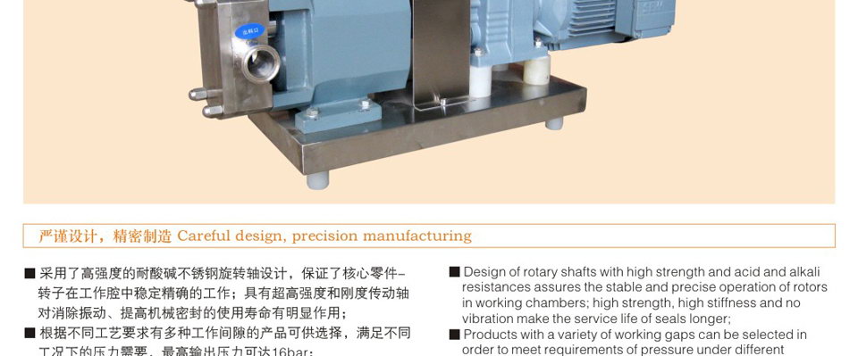 6、轉(zhuǎn)子和轉(zhuǎn)子之間絕無接觸,長期使用亦無磨損,運轉(zhuǎn)平穩(wěn),噪音低,效益高。 7、設(shè)計新穎、安裝維護簡單容易,方便清洗,保證機器內(nèi)部和生產(chǎn)衛(wèi)生清潔。